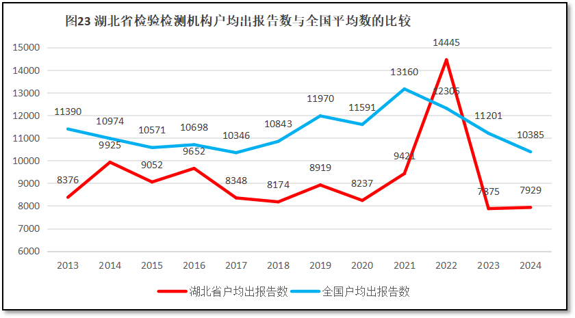 2024年度,湖北省检验检测机构户均出具检验检测报告7929份,是全国平均水平10385份的76.35%,全国排名第15位,处于中等水平,不过排名比2023年度提升了2位。2013年以来,湖北省检验检测机构户均出具检验检测报告数量与全国的比较,如图23所示。