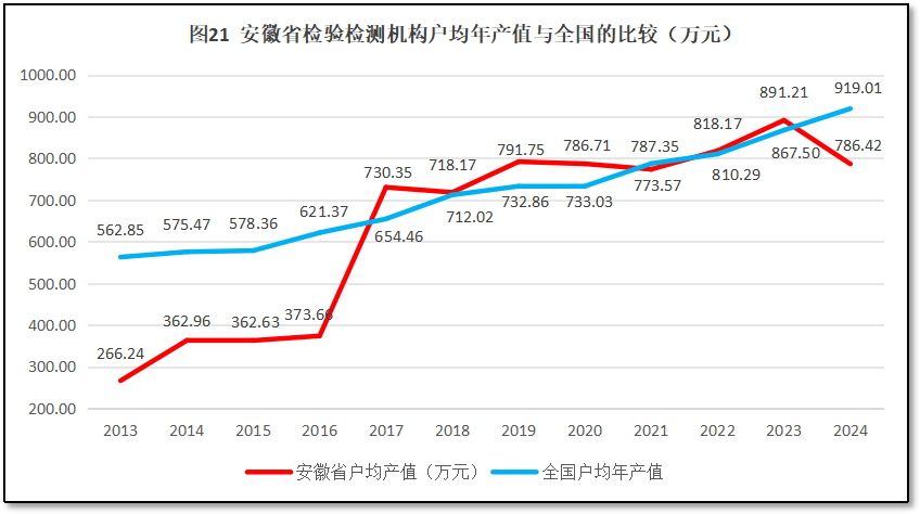 安徽省检验检测机构户均营业收入与全国情况的比较如图21所示。